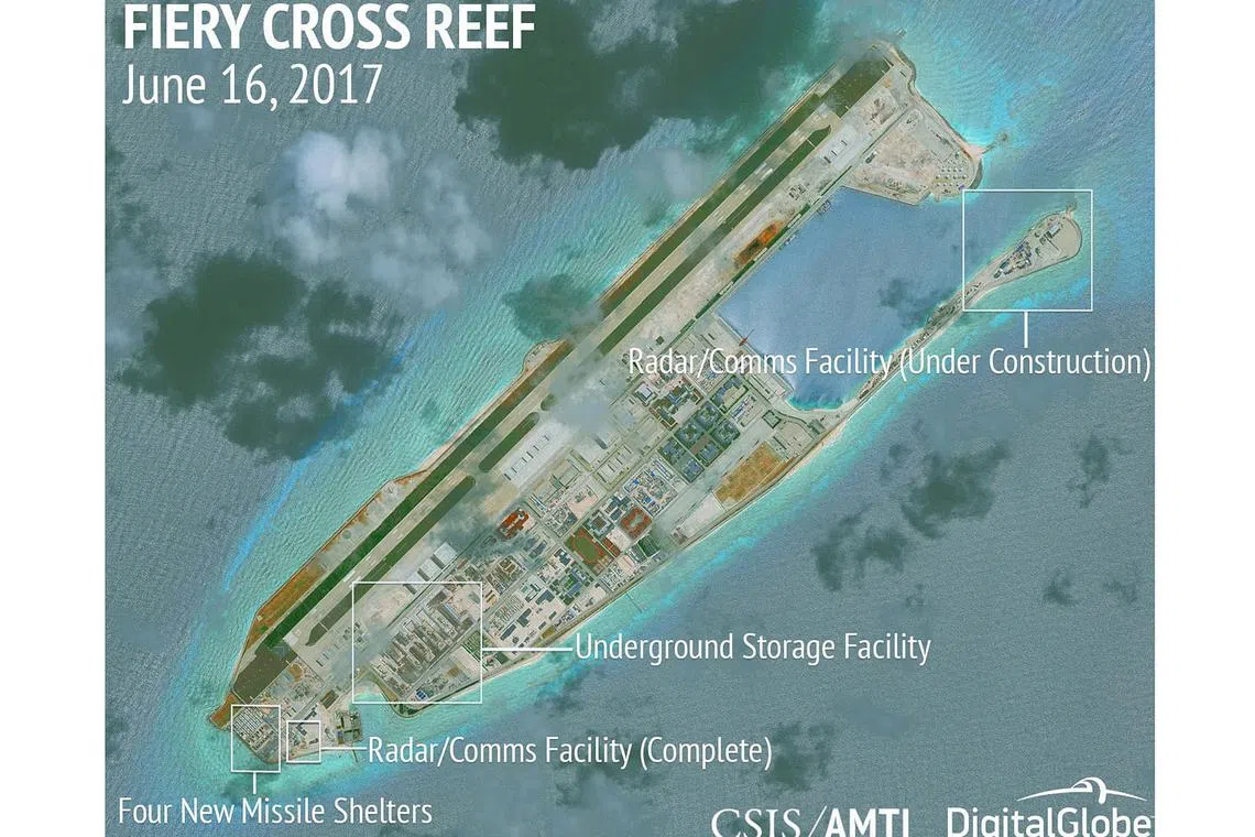 Menerusi analisis gambar satelit, Inisiatif Ketelusan Kelautan Asia (AMTI) berkata pangkalan Terumbu Fiery Cross di Kepulauan Spratly sudah ada 12 pelindung berbanding empat Februari lalu, dengan bumbung bergerak yang boleh menempatkan pelancar peluru berpandu. China turut memperluas teknologi komunikasi dan radar dengan kewujudan beberapa menara di pangkalan itu dan Terumbu Mischief dan Subi.
