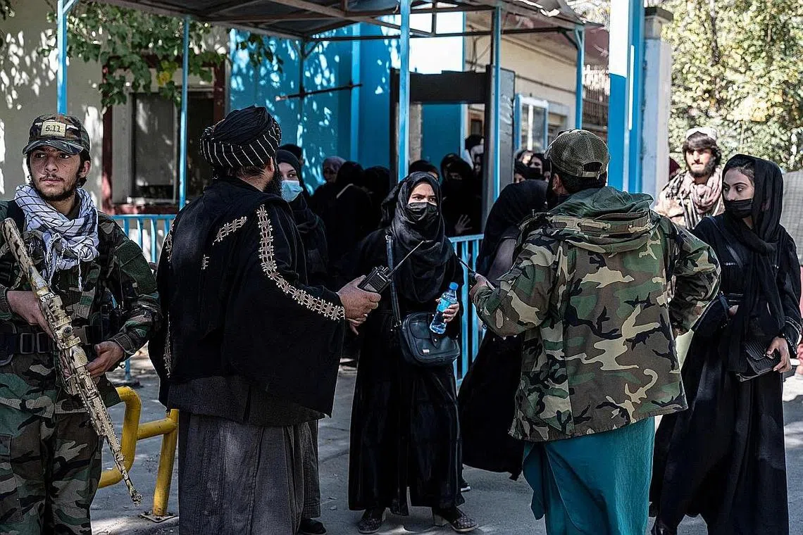 Berpakaian hitam dan bertudung, pelajar dikawal ketat oleh askar Taleban sedang mereka beratur di pintu masuk bilik peperiksaan di luar Universiti Kabul yang berprestij.