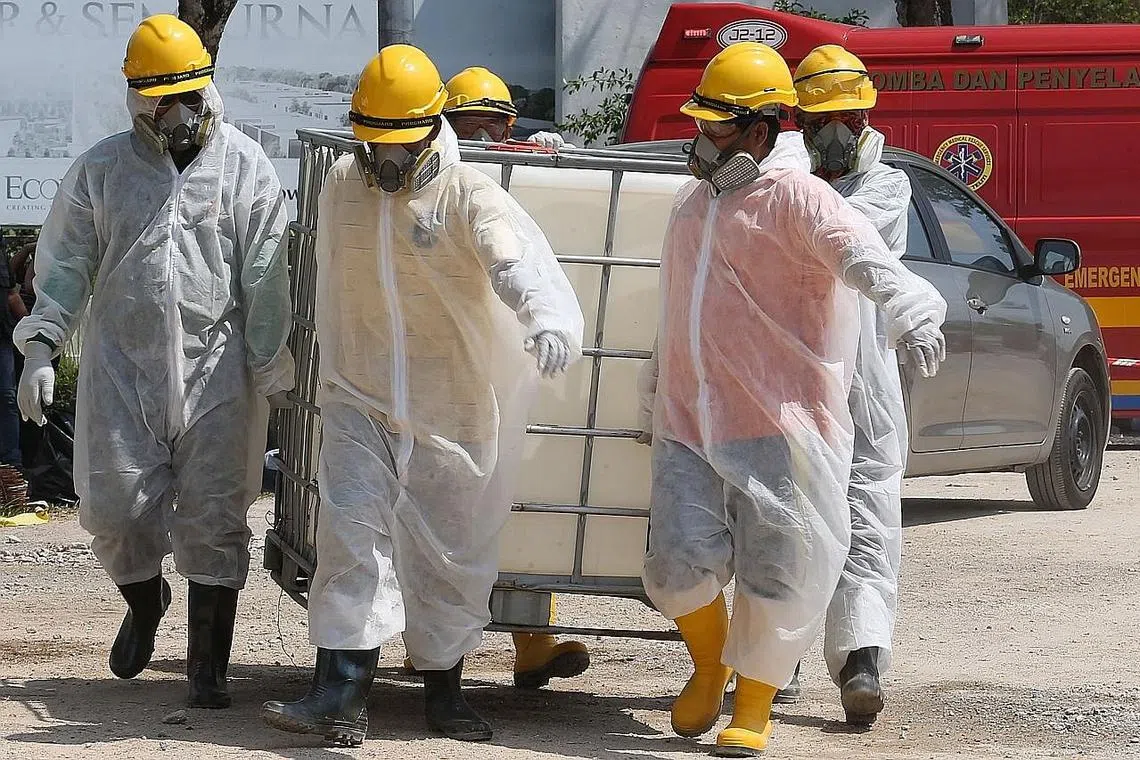 OPERASI PEMBERSIHAN: Beberapa kakitangan kecemasan memakai pakaian khas dilihat bersedia melakukan operasi pembersihan Sungai Kim Kim di Pasir Gudang. - Foto AFP -