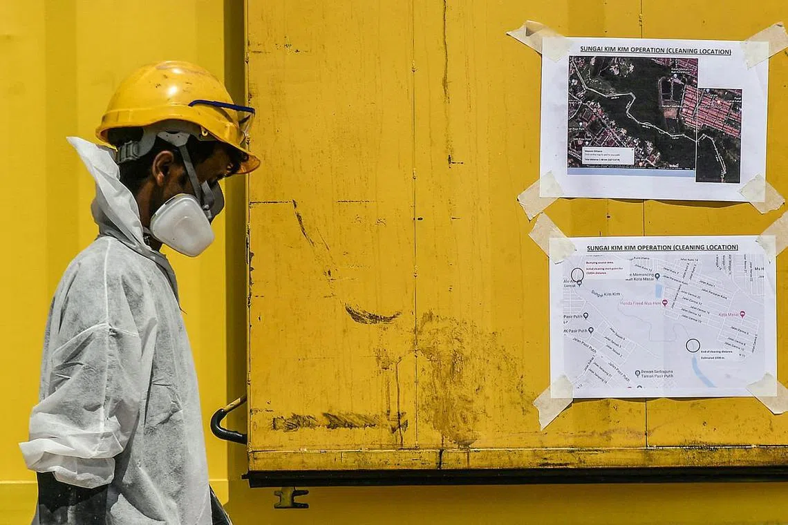 MASIH ADA LAGI TAPAK YANG TERCEMAR: Seorang kakitangan kecemasan dengan pakaian perlindungan di lokasi kerja pembersihanan di Sungai Kim Kim, Pasir Gudang. Pemeriksaan akhbar setempat menunjukkan ada tanda-tanda baru tapak pembuangan sisa lain dalam kawasan lima kilometer sungai itu. - Foto EPA-EFE -