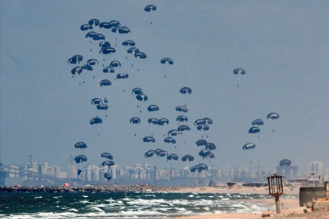 GAZA: Rakyat Gaza terus ternanti-nanti bekalan makanan yang digugurkan dari udara dekat kawasan pantai, di utara Jaluran Gaza yang kini dilanda kebuluran tanpa mempedulikan ramai yang maut ketika cuba mendapatkan bungkusan yang digugurkan dengan payung terjun.