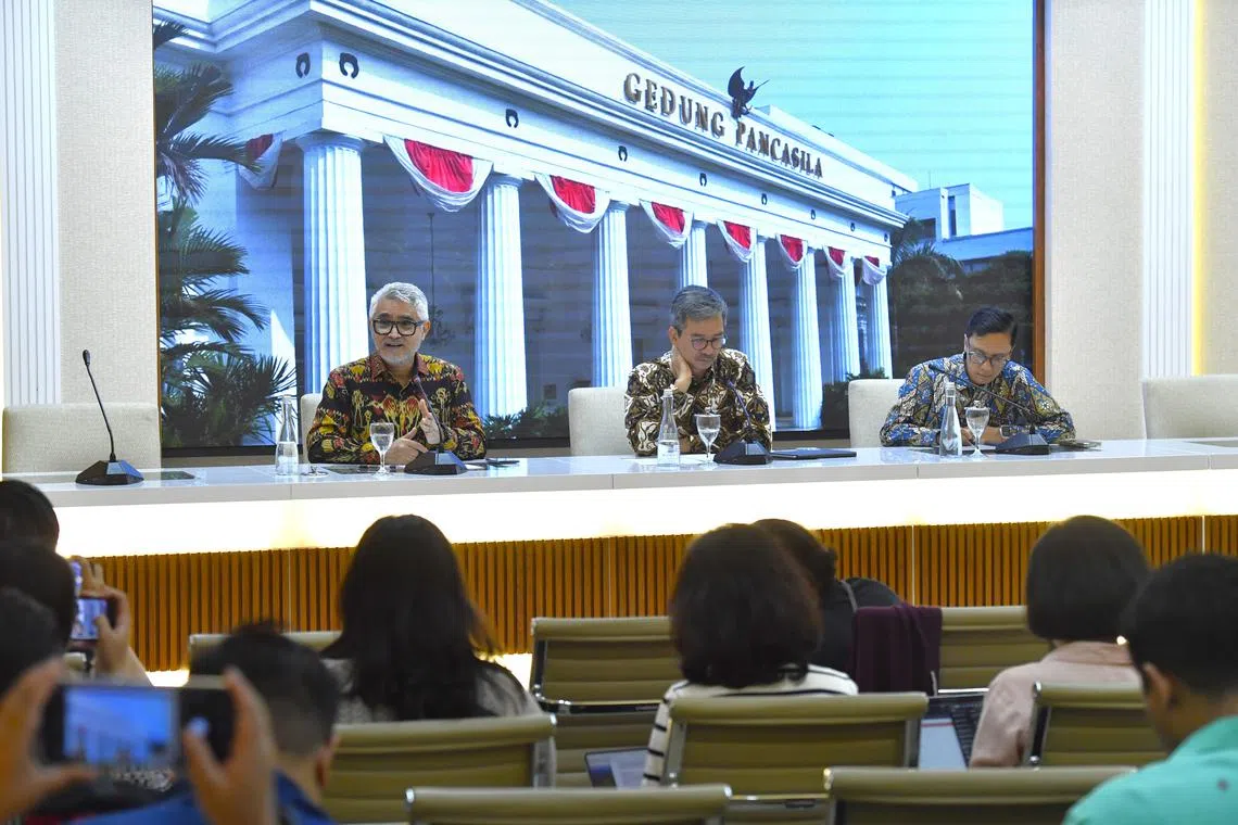Pegawai Kementerian Luar Indonesia, (dari kiri) Ketua Pengarah Asia Pasifik, Encik Abdul Kadir Jailani; Ketua Pengarah Hal Ehwal Undang-Undang dan Perjanjian Antarabangsa, Encik Amrih Jinangkung; dan Pengarah Maklumat dan Media, Encik Hartyo Harkomoyo, memberi respons dalam sidang akhbar di Jakarta pada 22 Julai terhadap keputusan Mahkamah Keadilan Antarabangsa (ICJ) mengenai pendudukan Israel di wilayah Palestin. - Foto KEMENTERIAN LUAR INDONESIA