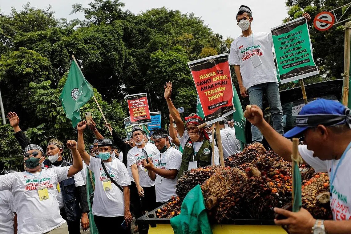 JAKARTA: Ratusan petani ladang kecil Indonesia semalam mengadakan bantahan di ibu kota Jakarta dan bahagian lain negara itu, menuntut pemerintah menamatkan larangan eksport minyak sawit yang telah mengurangkan pendapatan mereka.