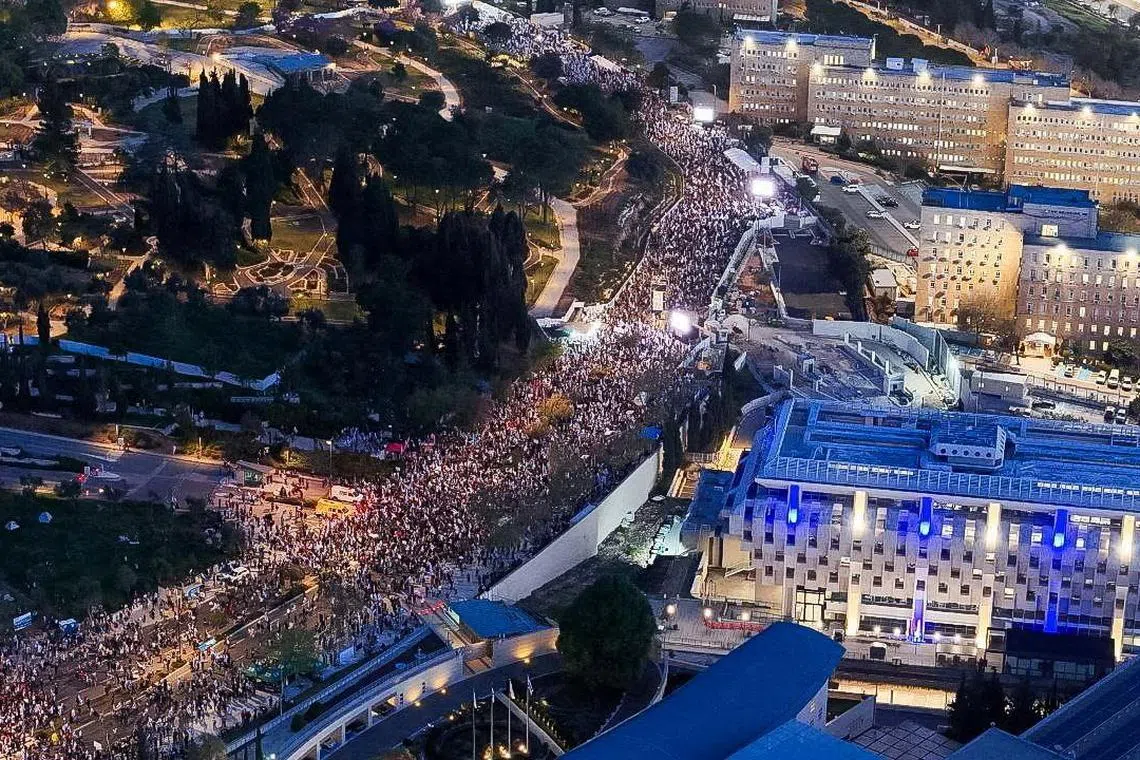 BAITULMAKDIS: Puluhan ribu rakyat Israel menyerbu pusat bandar Baitulmakdis pada 31 Mac dalam protes anti-pemerintah terbesar sejak negara itu berperang pada Oktober.
