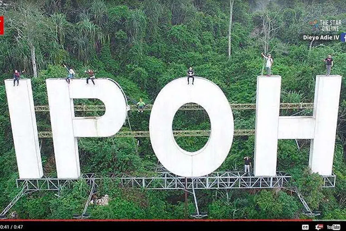 Lapan orang, termasuk tiga wanita muda, memasang buaian di tanda 'IPOH' gergasi dan mengambil gambar menggunakan sebuah dron.