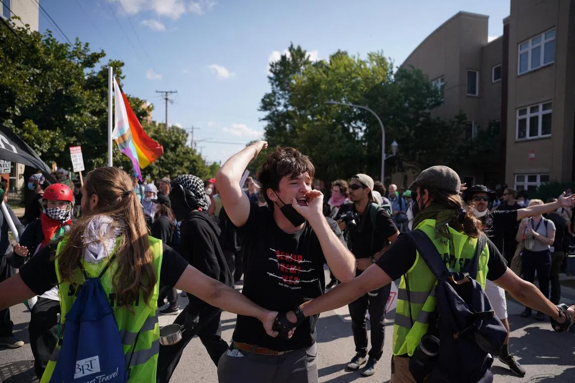CHICAGO: Beribu-ribu penunjuk perasaan berarak di Chicago pada 19 Ogos ketika berlangsungnya Konvensyen Nasional Demokrat – ujian awal langkah keselamatan bandar itu dan percubaan Naib Presiden Amerika Syarikat, Cik Kamala Harris, untuk menunjukkan perpaduan dalam parti.