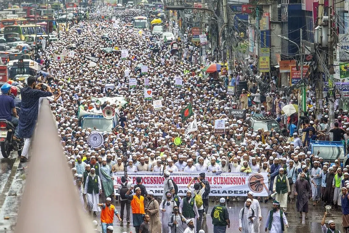 Melaungkan slogan seperti "Umat Islam dunia bersatu!", penunjuk perasaan Bangladesh berhimpun di hadapan masjid terbesar Dhaka dan cuba berarak ke kedutaan India sebelum disekat polis.