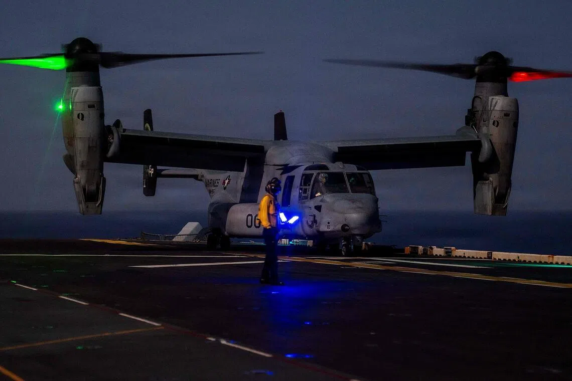 Sebuah pesawat ‘MV-22 Osprey’ bersiap untuk berlepas di dek penerbangan kapal serangan amfibia kelas Amerika Syarikat, USS Tripoli (LHA 7), semasa Operasi ‘Epic Fury’ pada 2 April. Tentera Amerika memaklumkan ia akan memulakan sekatan terhadap semua pelabuhan Iran pada 13 April selepas rundingan antara pihak bertelagah di Pakistan gagal. - Foto AFP