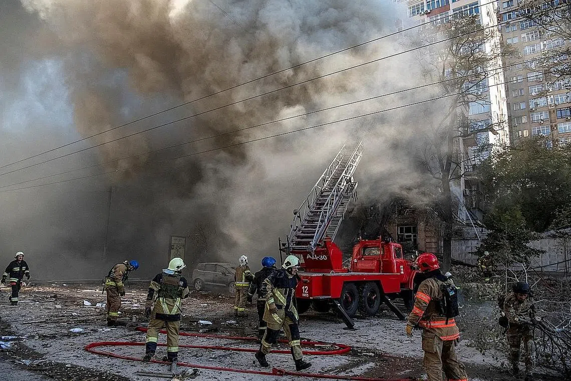 Asap hitam kelihatan keluar dari tingkap bangunan flat Kyiv dan pekerja perkhidmatan kecemasan bertungkus-lumus memadamkan api.
