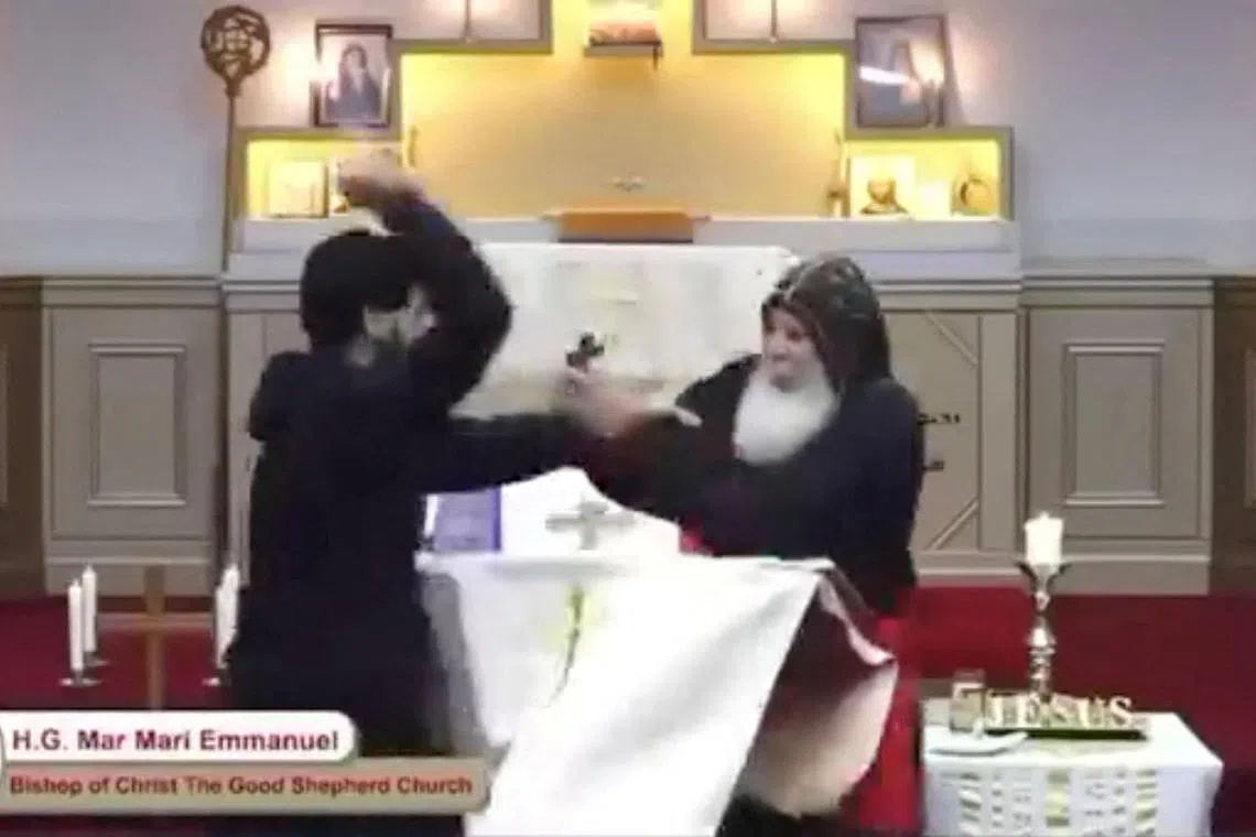 Pemimpin gereja berkenaan dilihat rebah ke lantai dan kedengaran suara jeritan pengikutnya yang kemudiannya menerpa ke arahnya untuk membantu sebelum siaran langsung itu terputus.