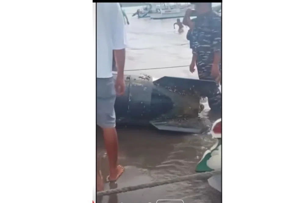 Objek sepanjang 3.7 meter dan berdiameter 65 sentimeter itu ditemui oleh nelayan pada Isnin kira-kira 10 kilometer dari pulau pelancongan terkenal Gili Trawangan di Nusa Tenggara Barat, menurut Tentera Laut Indonesia. - Foto Tangkapan layar media sosial