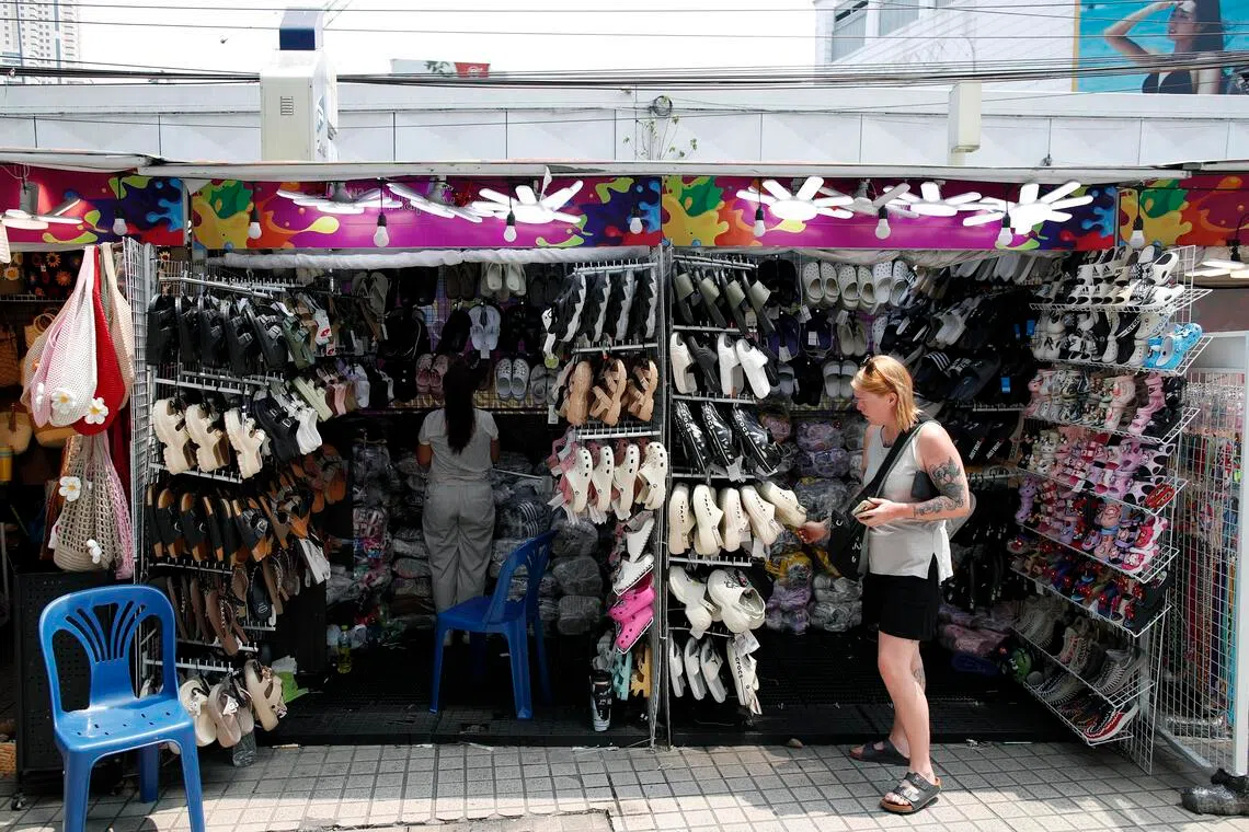 Seorang pelancong asing melihat-lihat selipar di sebuah kedai tepi jalan di Bangkok, Thailand pada 20 April. Tabung Kewangan Antarabangsa (IMF) menyemak turun unjuran pertumbuhan ekonomi Thailand kepada 1.5 peratus daripada 1.6 peratus sebelum ini, yang dijangka menjadi kadar paling perlahan di Asean susulan perang di Asia Barat. - Foto EPA