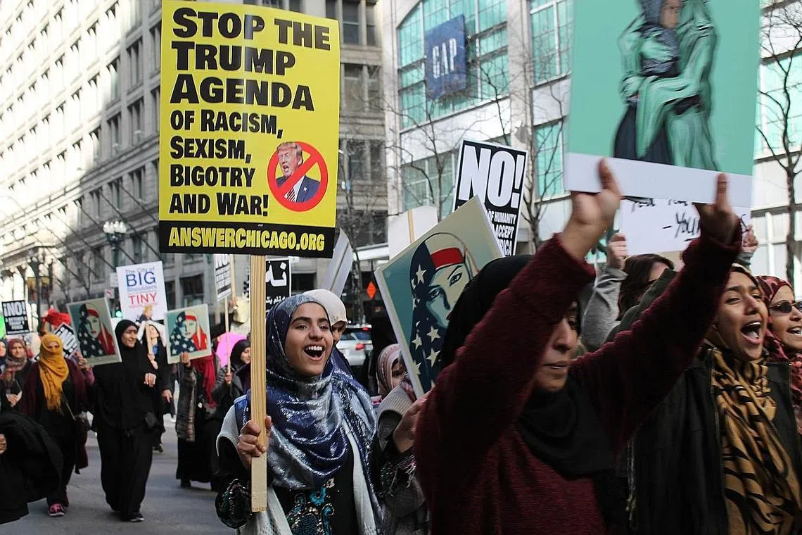 ADAKAN BANTAHAN: Gerakan #IAmAMuslimToo telah mengadakan tunjuk perasaan di Chicago, Illinois, bagi membantah larangan perjalanan ke atas rakyat tujuh negara majoriti Islam yang dikeluarkan Presiden Trump, Januari lalu. - Foto AFP -