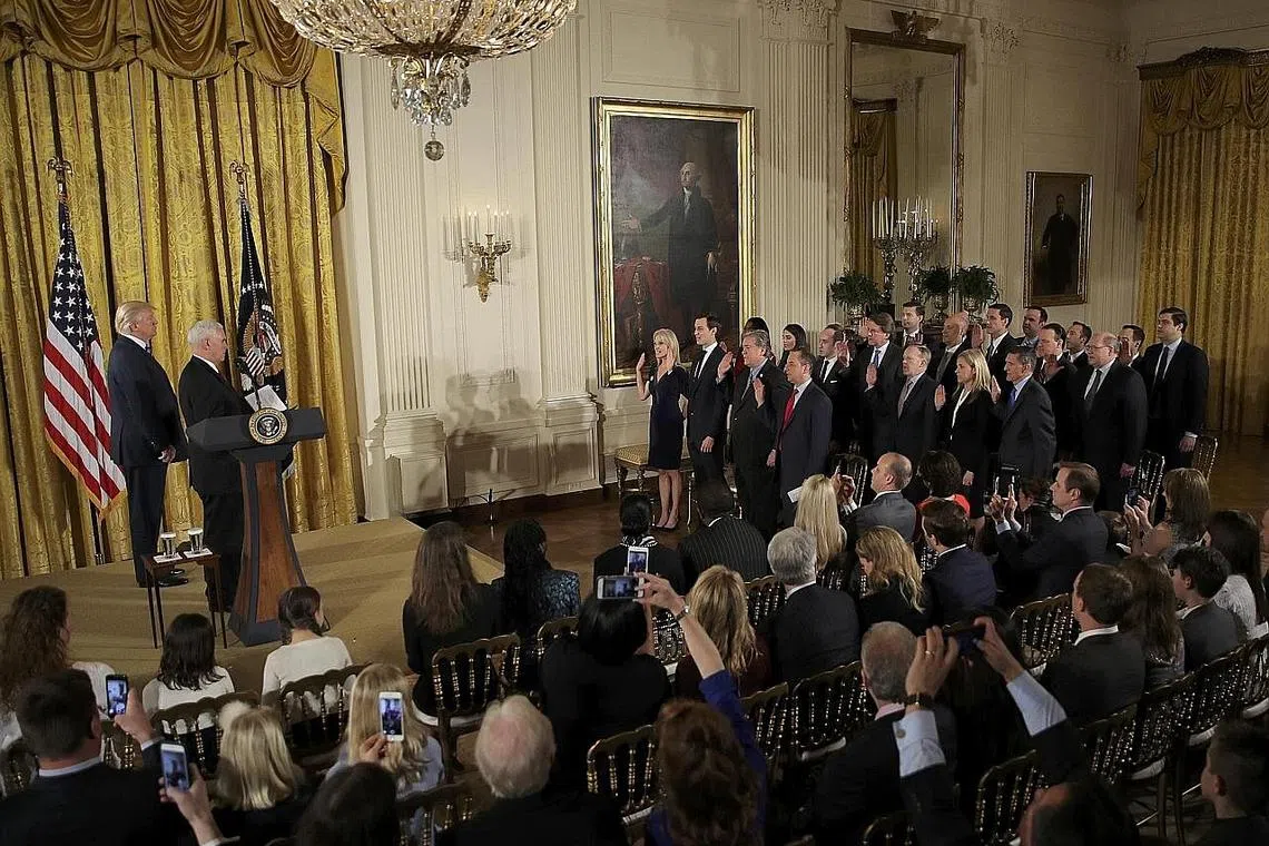 BARISAN BARU: Encik Donald Trump (kiri) memerhatikan upacara angkat sumpah kakitangan kanan di Rumah Putih yang dipimpin oleh Naib Presiden Mike Pence (dua dari kiri) semalam. - Foto REUTERS -