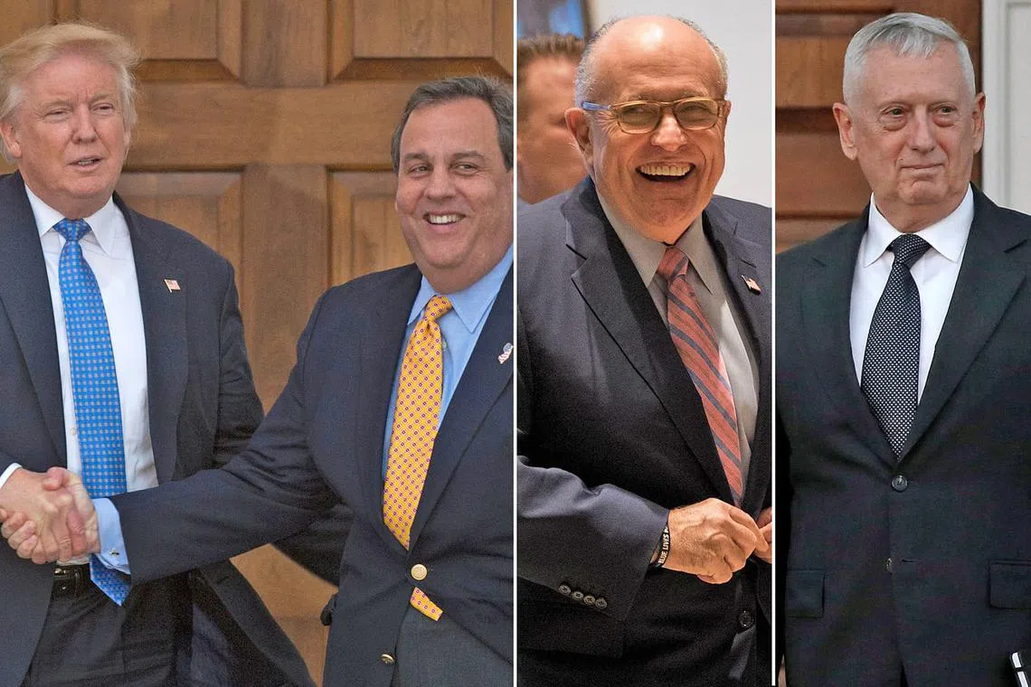 ANTARA CALON JAWATAN TINGGI: (Dari kiri) Encik Donald Trump dengan Gabenor New Jersey, Encik Chris Christie; mantan Datuk Bandar New York, Encik Rudy Giuliani yang disebut-sebut sebagai calon Setiausaha Negara; dan jeneral bersara, Encik James Mattis, yang dipertimbangkan sebagai Setiausaha Pertahanan. - Foto-foto AFP, REUTERS -