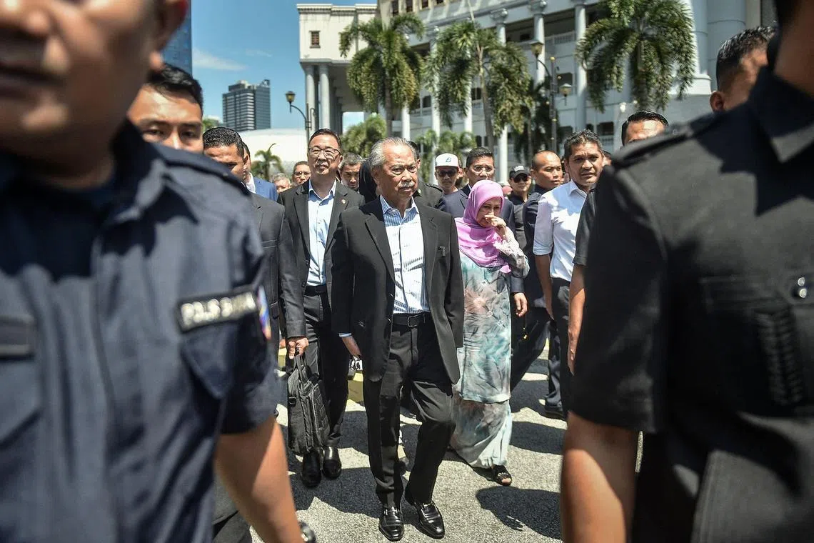 Tan Sri Muhyiddin, 76 tahun, dituduh menggunakan kuasanya untuk mendapatkan rasuah buat partinya, Bersatu, berjumlah RM232.5 juta daripada tiga syarikat, iaitu Bukhary Equity Sdn Bhd, Nepturis Sdn Bhd dan Mamfor Sdn Bhd, dan juga daripada seorang bernama Datuk Azman Yusoff.