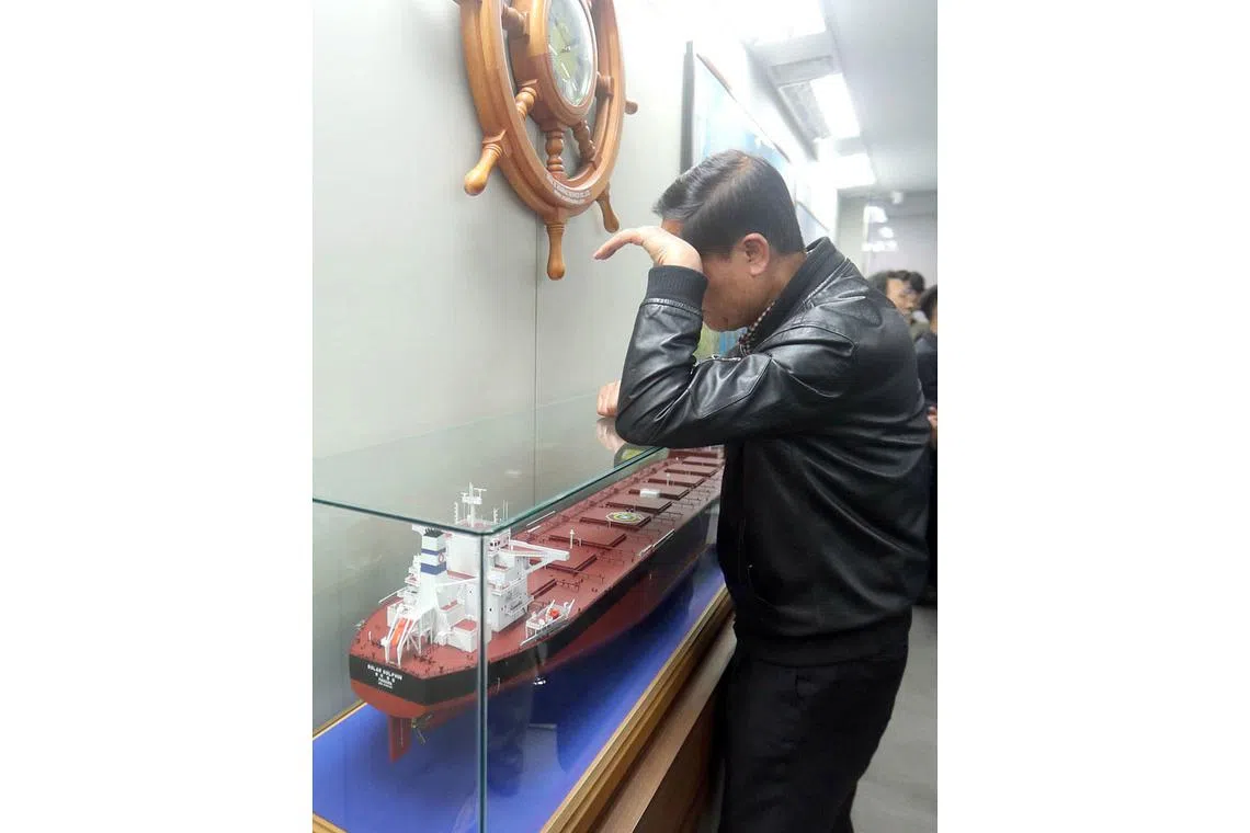 PENCARIAN DITERUSKAN: Ahli keluarga melihat model kapal 'Stella Daisy' sementara menunggu maklumat mengenai nasib anak kapal kargo itu, di ibu pejabat syarikat perkapalan Polaris Shipping di Busan, Korea Selatan. - Foto AFP -