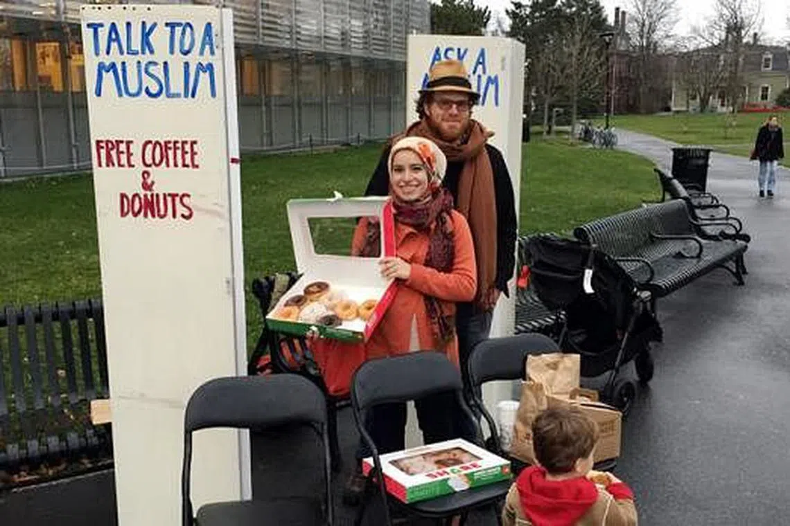 Cik Mona Haydar dan suaminya, Encik Sebastian Robins, telah meletakkan papan tanda yang ditulis dengan perkataan "Tanya seorang Muslim" dan "Bersembang dengan seorang Muslim" di luar perpustakaan Cambridge di Boston, Massachusetts, Amerika Syarikat, minggu lalu.