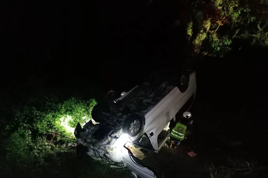 “Pasukan Bomba dan Penyelamat yang tiba di tempat kejadian mendapati kemalangan melibatkan sebuah van yang membawa pelancong dari Singapura telah terbabas lalu terjatuh ke cerun bukit dengan kedalaman hampir 20 kaki (enam meter),” katanya.