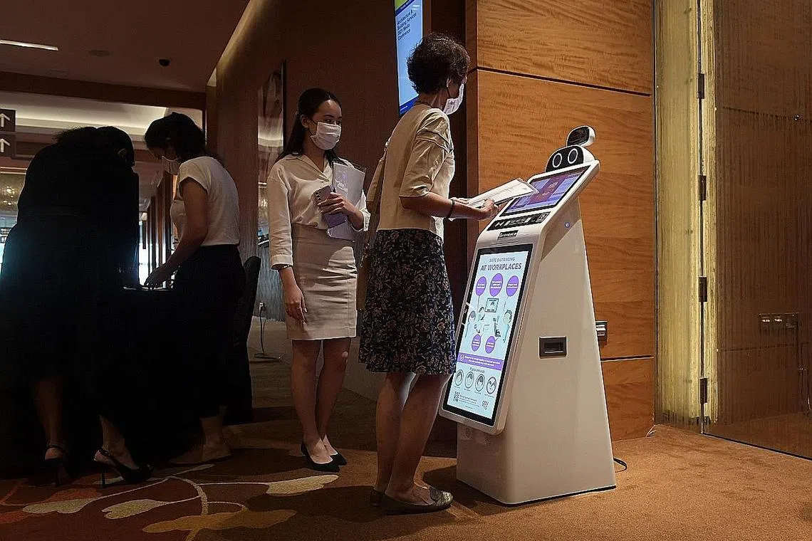 LANGKAH-LANGKAH SELAMAT: Robot CG5ServBot, yang dapat mengambil suhu badan tiga orang sekaligus dikerahkan dan akan dapat mengurangkan jumlah kakitangan yang diperlukan pada setiap pintu masuk. - Foto BH oleh ALPHONSUS CHERN -