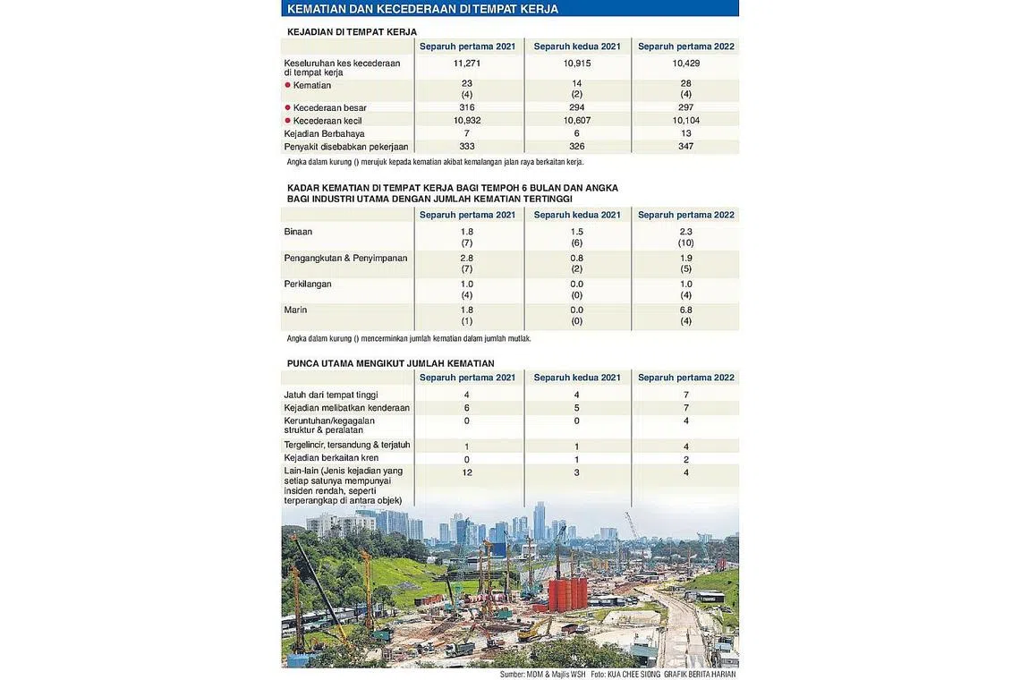 Sektor binaan menyumbang jumlah kematian dan kecederaan besar di tempat kerja yang tertinggi, dengan 10 kematian dan 84 kes kecederaan besar dilaporkan dalam separuh pertama tahun ini.