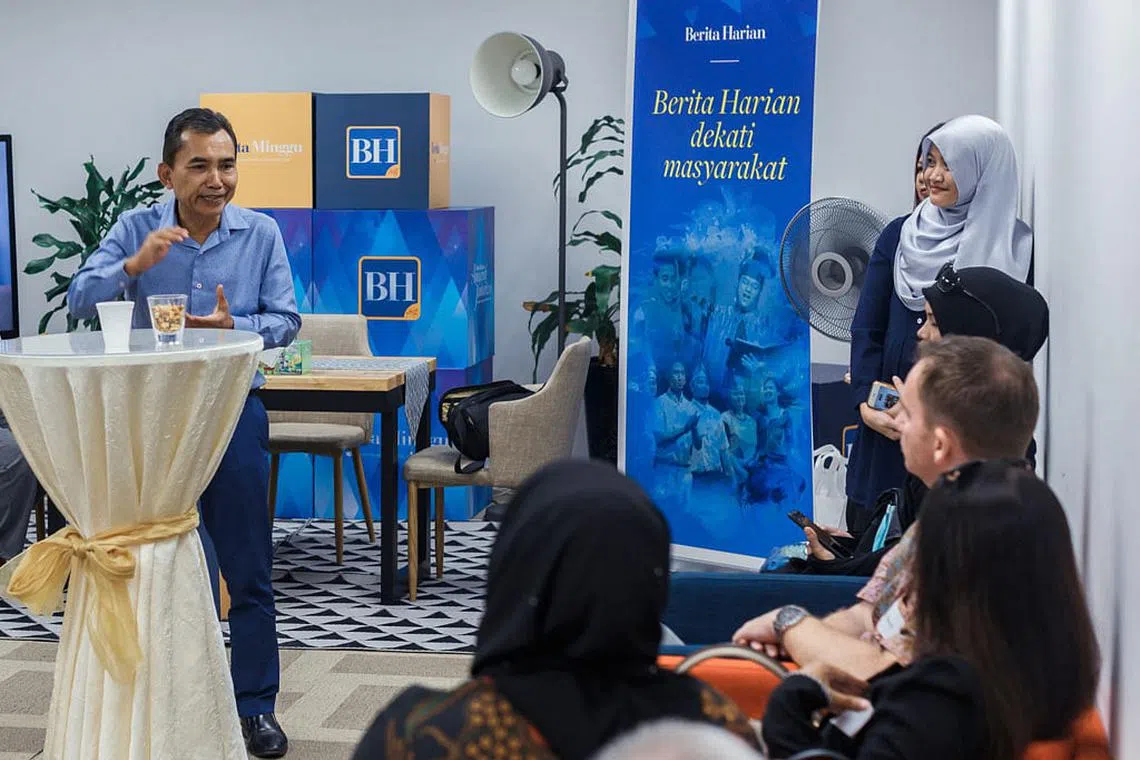 SALING BERKENALAN: Sesi pertemuan antara kakitangan Berita Harian (BH) dengan para peniaga syarikat kecil dan sederhana (SME) di pejabat BH di Toa Payoh kelmarin, yang bertujuan memberi peluang kepada kedua-dua pihak mengenali satu sama lain. - Foto BH oleh IQBAL FAIZAL -