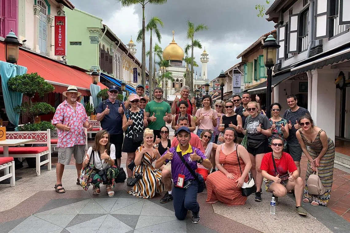 PENDAPATAN MEROSOT: Sejak pandemik Covid-19 melanda, pemandu pelancong bebas. Encik Basirun Mansor (paling depan, berbaju ungu) kehilangan 90 peratus pendapatannya kerana ketiadaan pelancong yang datang mengunjungi Singapura. Gambar beliau bersama sekumpulan pelancong di kawasan Kampung Glam ini diambil sebelum berlakunya pandemik Covid-19. - Foto MONSTER DAY TOURS -