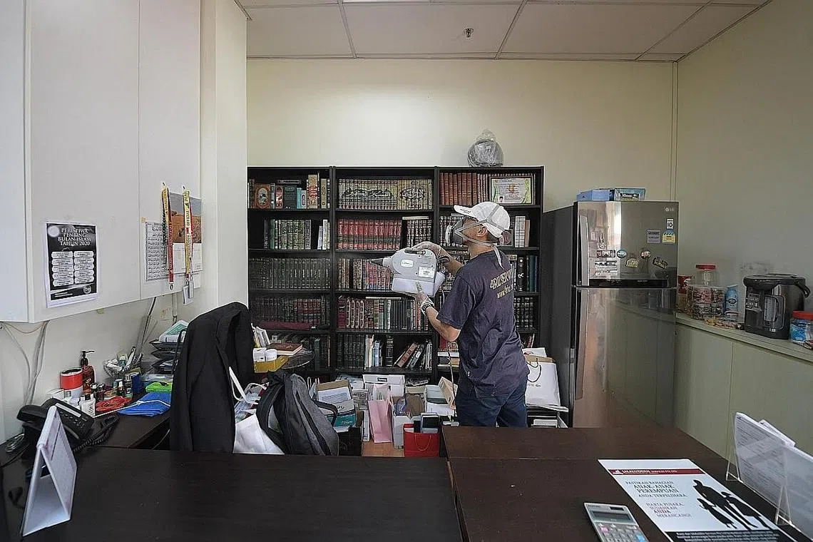 SESUAIKAN DENGAN SITUASI: Seorang pekerja 4riz Services Pte Ltd menjalankan kerja pembasmian kuman di pejabat pelanggan di Changi Road. Syarikat perkhidmatan pemindah itu kini memberi lebih tumpuan pada perkhidmatan pembasmian kuman kerana dalam tempoh ini ia tidak dapat menerima banyak tempahan bagi perkhidmatan pemindah. - Foto BH oleh ALPHONSUS CHERN -