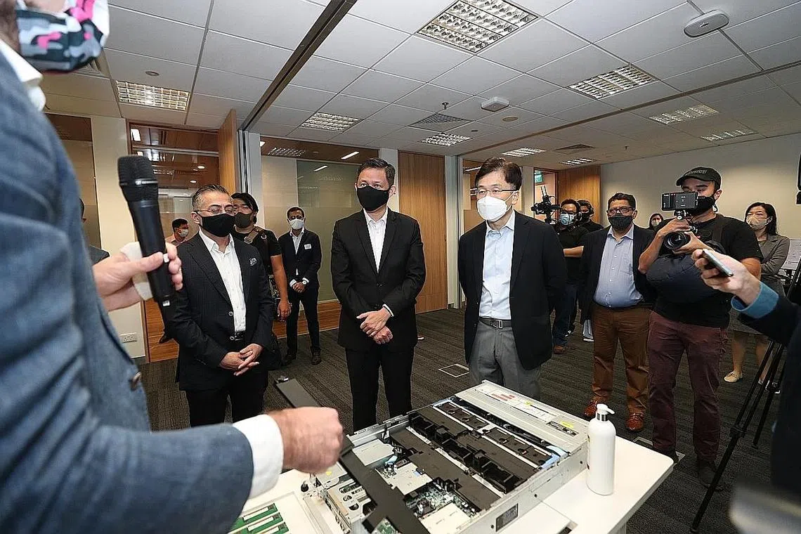 HAB INOVASI GLOBAL: Menteri Perdagangan dan Perusahaan Chan Chun Sing (tiga dari kiri) menghadiri pelancaran Hab Inovasi Global syarikat Dell Technologies semalam. Pusat itu akan memberi tumpuan pada bidang seperti realiti tambahan atau gabungan, analisis data dan bandar digital. - Foto BH oleh TIMOTHY DAVID -
