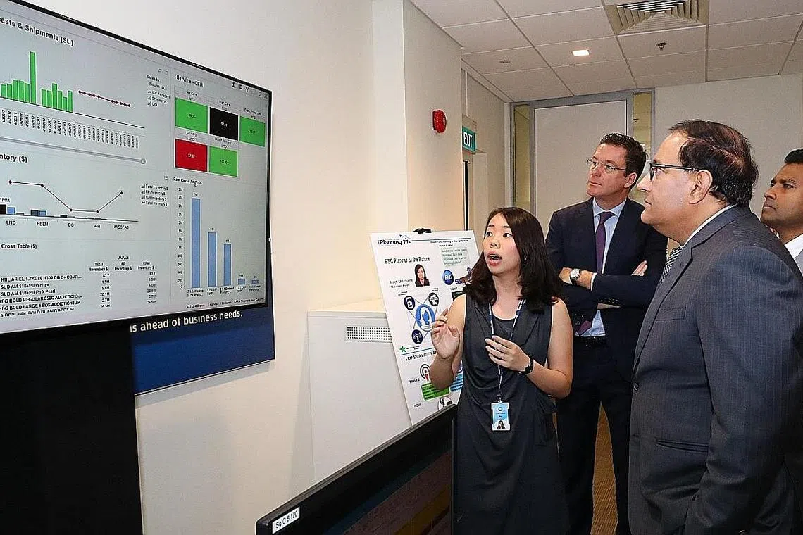GUNAKAN ANALITIK DATA: Encik Iswaran (kanan) melihat skrin yang menunjukkan analitik data di Pusat-E Singapura P&G. - Foto ZAOBAO -