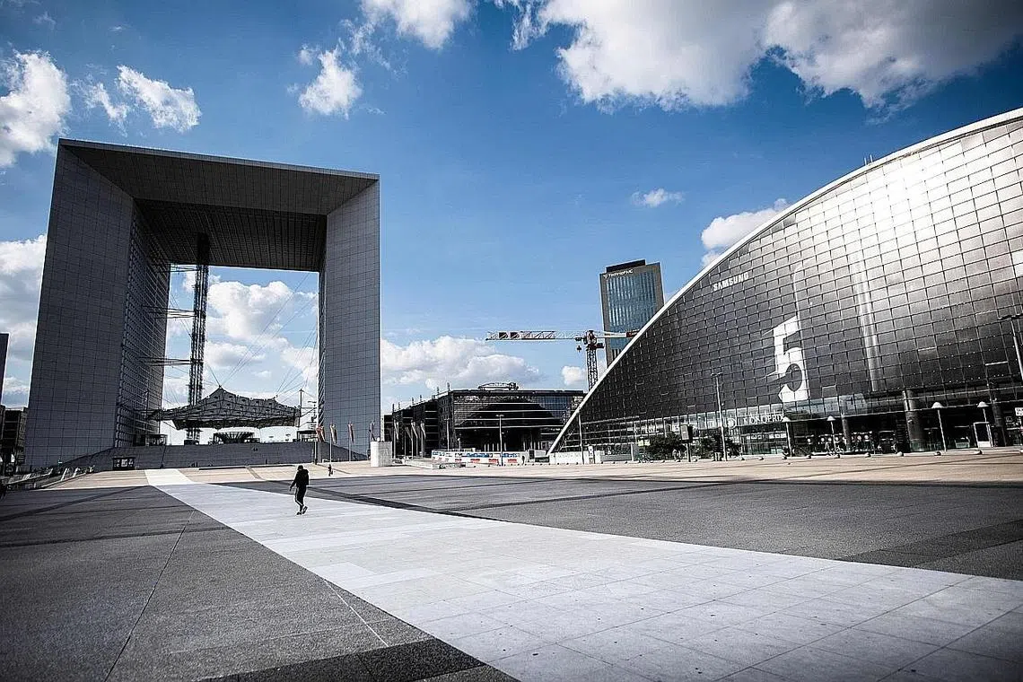 KESAN COVID-19: Keadaan lengang di daerah kewangan La Defense di Paris akibat langkah sekatan mencegah Covid-19. Dana Kewangan Antarabangsa (IMF) meramalkan Ekonomi zon Euro dijangka menguncup 7.5 peratus secara keseluruhan. Ekonomi Perancis misalnya dijangka menguncup 7.2 peratus. Namun IMF berkata rantau Asia merupakan satu-satunya rantau yang dijangka menikmati pertumbuhan ekonomi tahun ini. - Foto AFP -