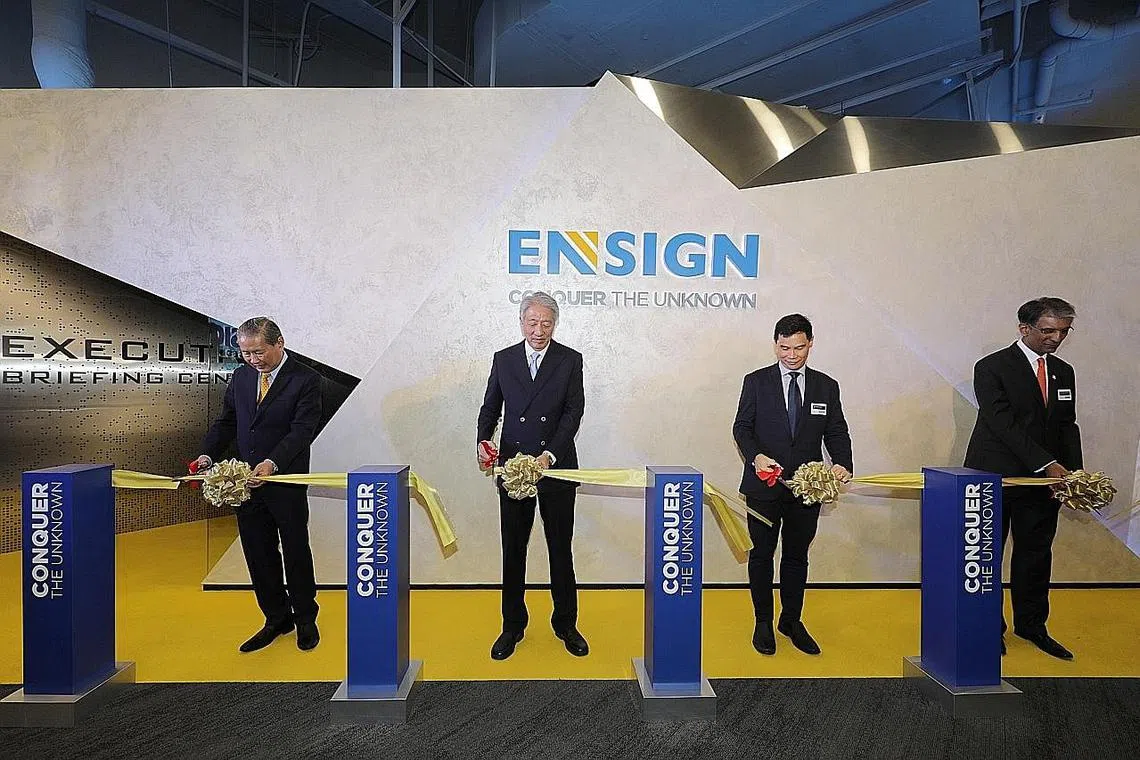 BANGUN KEUPAYAAN: Encik Teo (dua dari kiri) melancarkan Ensign InfoSecurity (Ensign), salah sebuah firma keselamatan siber terbesar Asia Tenggara, semalam. Beliau menyatakan Singapura perlu memupuk bakat, berinovasi dan berkolaborasi dengan syarikat lain bagi mempertajam keupayaan dalam keselamatan siber. - Foto ZAOBAO -