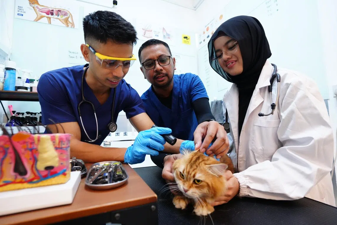 (Dari kiri) Teknisyen penjagaan haiwan, Encik Ilyas Fergo Junaidi bersama abangnya; pengasas KAET, Encik Ibrahim Fergo Junaidi; dan teknisyen penjagaan haiwan kanan, Cik Hanis Shameen Mohamed Feroz, sedang menilai tahap kesihatan kucing di pusat penjagaan kucing KAET di Centropod, berhampiran Geylang Serai. - Foto BH oleh NUR DIYANA TAHA