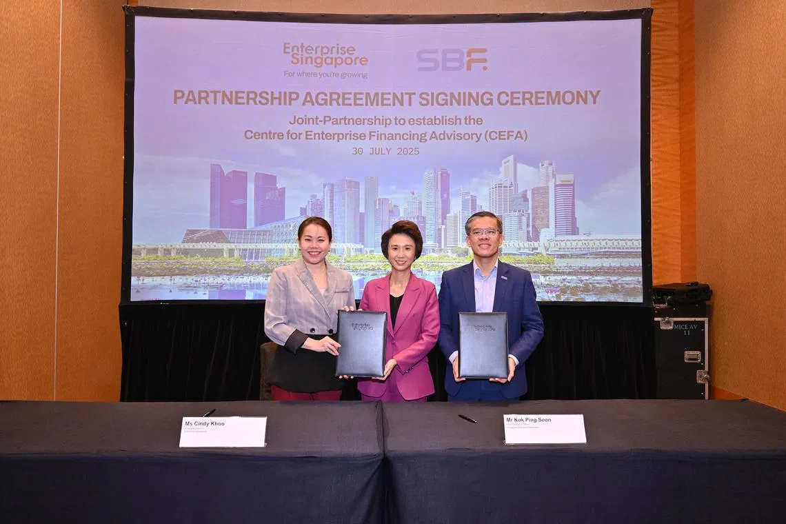 Menteri Negara Kanan (Kebudayaan, Masyarakat dan Belia merangkap Perdagangan dan Perusahaan), Cik Low Yen Ling (tengah), menyaksikan perjanjian kerjasama yang ditandatangani antara Pengarah Urusan Enterprise Singapore, Cik Cindy Khoo (kiri), dengan Ketua Pegawai Eksekutif (CEO) Persekutuan Perniagaan Singapura (SBF), Encik Kok Ping Soon, untuk menubuhkan Pusat Penasihat Pembiayaan Perusahaan (Cefa). Majlis itu diadakan sempena Persidangan Pusat SME Ke-12 yang diadakan di Pusat Konvensyen dan Ekspo Sands pada 30 Julai.