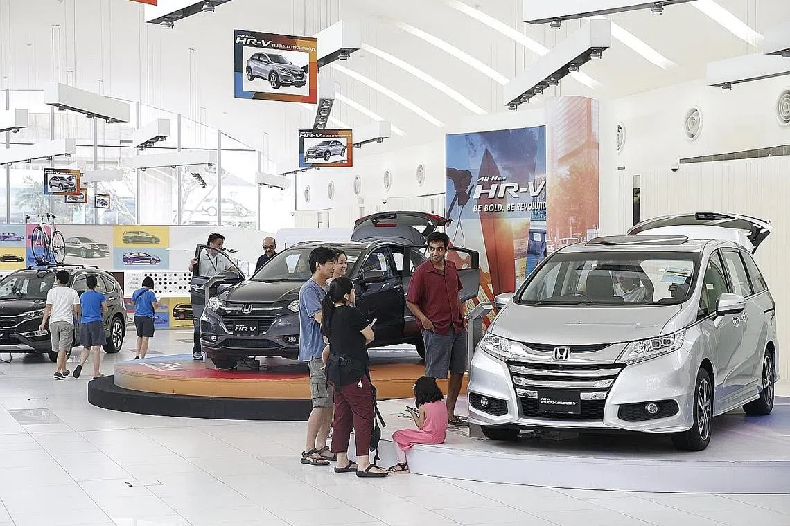 MELIHAT KERETA IDAMAN: Bakal pembeli kereta melihat-lihat kereta Honda yang dijual di bilik pameran Honda di Alexandra Road. - Foto fail THE STRAITS TIMES -