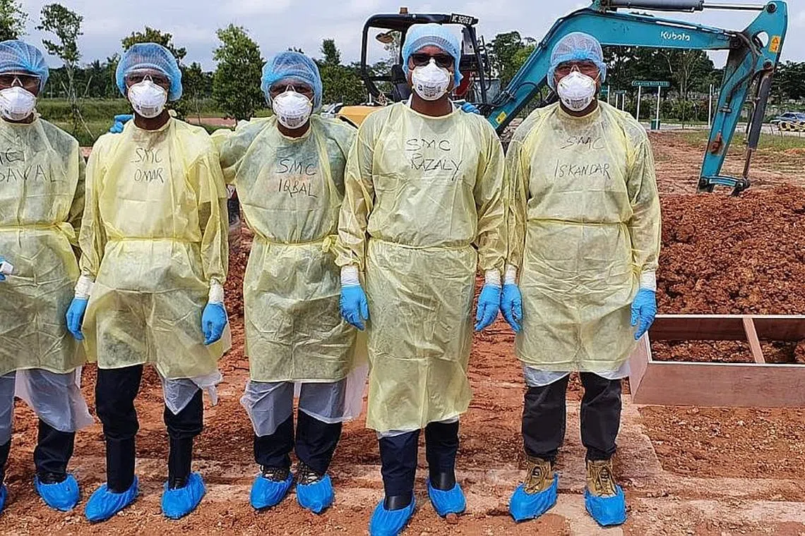 PERALATAN TAMBAHAN: Encik Iskandar (paling kanan) dan kakitangannya mengenakan peralatan tambahan semasa menguruskan jenazah pesakit penyakit berjangkit seperti Covid-19. Antara peralatan yang digunakan ialah pelitup N95 dan peralatan pelindung peribadi (PPE). - Foto ihsan SINGAPORE MUSLIM CASKET & MARBLE CONTRACTOR -