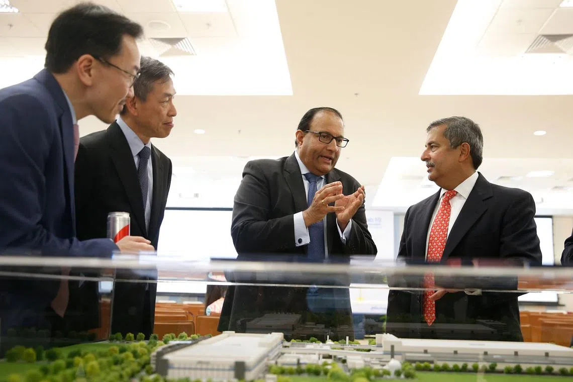 YAKIN TERHADAP SINGAPURA: Encik Iswaran (dua dari kanan) menyatakan peluasan Micron mencerminkan keyakinan syarikat itu di Singapura. Ketua eksekutif Micron Techology, Encik Sanjay Mehrotra berada di sebelah. - Foto BH oleh TIMOTHY DAVID -