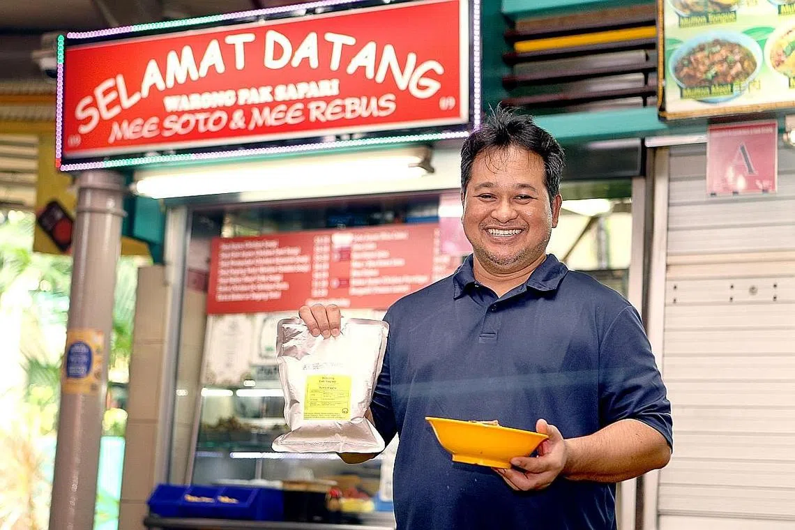 KEMBANGKAN NIAGA: Encik Sumadi telah mengeluarkan pes kuah soto yang dijual di gerainya di Warong Pak Sapari di Pusat Penjaja Adam Road. - Foto BH oleh ZHANG XUAN -