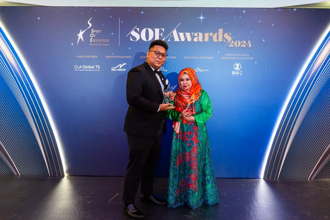 Pengasas The Muscle Remedy Pte Ltd, Encik Muhammad Nursalman Fitri Fareed (kiri), menerima Anugerah Pemula SOE-Neo bersama penerima Anugerah SOE, Cik Fadilah Abdul Majid, pemilik dan Pengarah Urusan, SpaJelita Pte Ltd. - Foto SPIRIT OF ENTERPRISE (SOE)