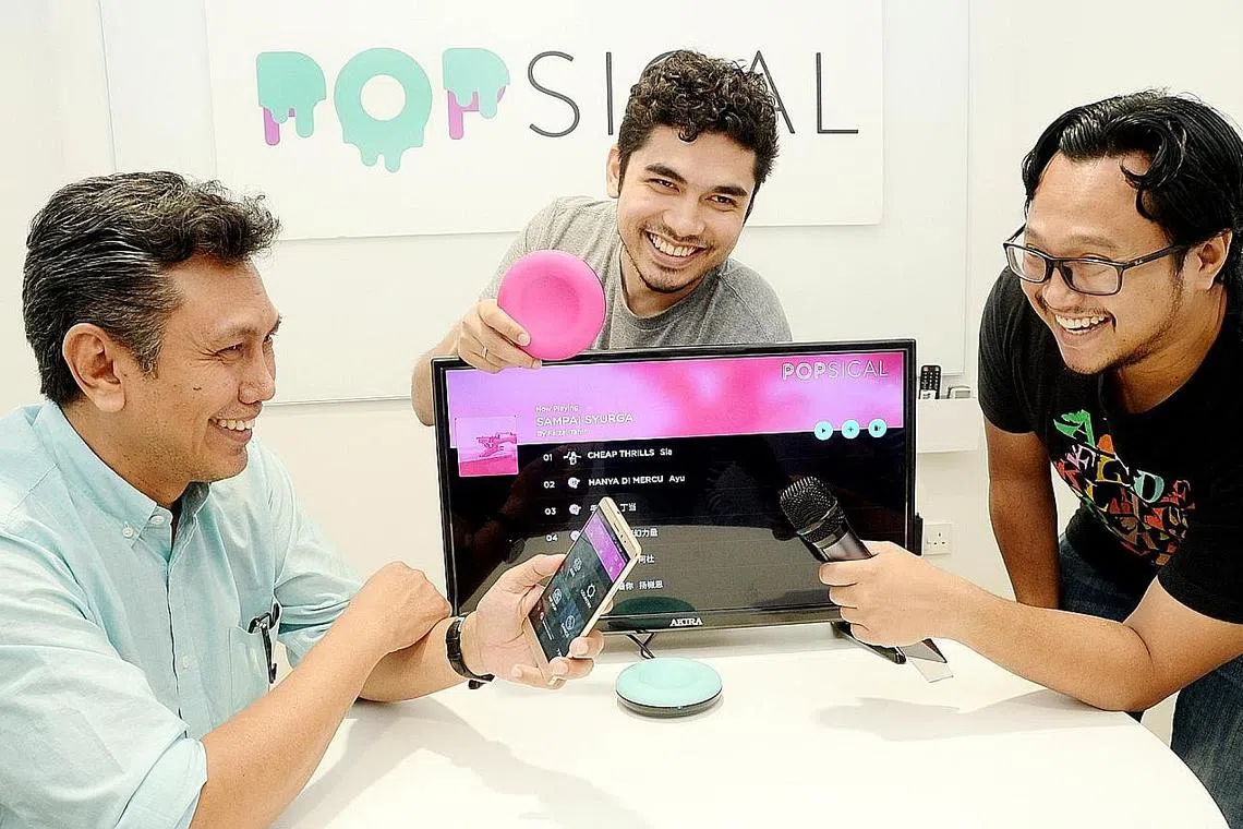 MEROMBAK INDUSTRI KARAOKE: (Dari kiri) Encik Umar, Encik Faruq dan Encik Fadhli telah berusaha menghasilkan Popsical (alat berwarna merah jambu yang dipegang Encik Faruq) sejak setahun lalu. - Foto JOHARI RAHMAT -