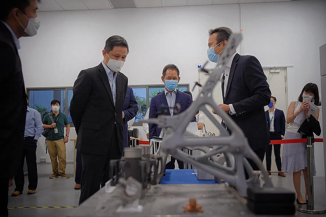 MEMBANGUN SEKTOR PERKILANGAN LANJUTAN: Encik Chan (kiri) mengunjungi Pusat Transformasi Perkilangan Lanjutan (AMTC) Siemens di Tuas semalam. Pusat itu bertujuan menyediakan panduan, sokongan dan latihan kepada syarikat Asia Tenggara yang sedang beralih ke arah perkilangan lanjutan. - Foto BH oleh Mark Cheong -