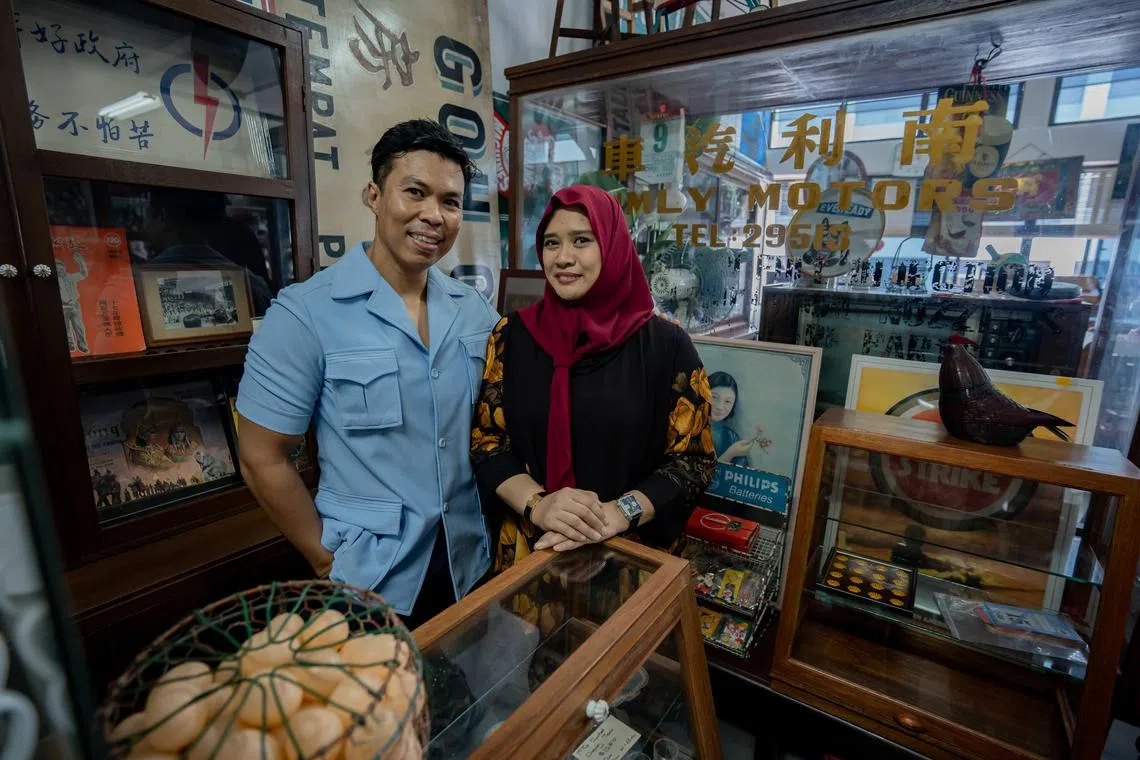 Pasangan suami isteri, Encik Mohamed Sadri Mohamed Farick dan Cik Nur Aryana Aziz, menawarkan pelbagai barangan antik di kedai mereka, Treasure At Home, di Bangunan Kilang Kapo dekat Macpherson. - Foto BH oleh NUR DIYANA TAHA
