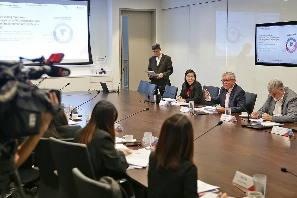 BENTANG TINJAUAN: (Dari kiri) Pengarah Penyelidikan & Penerbitan SBF, Encik Mr Edwin Heng; Timbalan Ketua Pegawai Eksekutif, Strategi & Pembangunan SBF, Cik Joanne Guo; CEO SBF, Encik Ho Meng Kit; dan Pengarah Urusan Blackbox Research, Encik David Black, di sidang akhbar berkaitan Tinjauan Perniagaan Nasional. - Foto BH oleh KEVIN LIM -