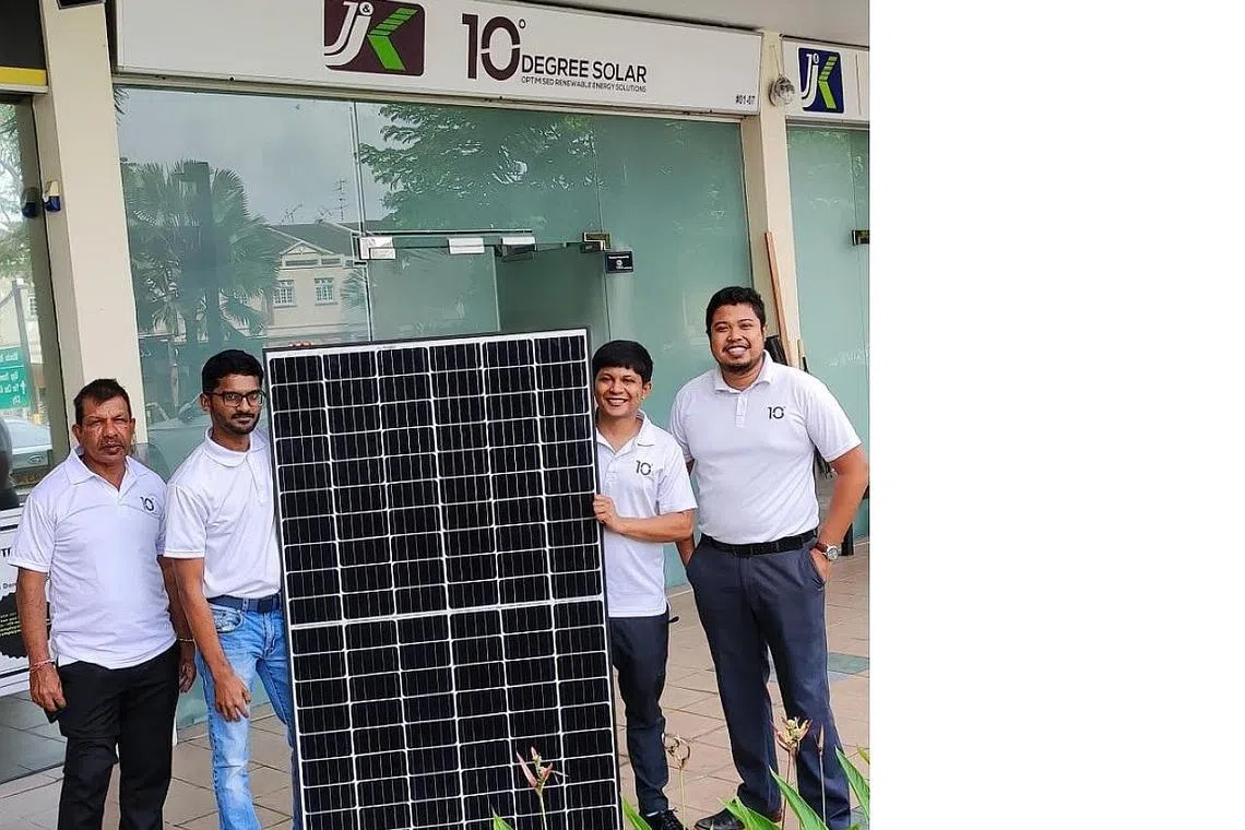 BANGUNKAN FIRMA ATAS DASAR YAKIN DAN TIDAK PUTUS ASA: Encik Muhammad Furqan (kanan) bersama (dari kiri) Encik Kummah, rakan niaga daripada syarikat JJ&K Engineering; dan dua pekerjanya Manikandan dan Adnand, di depan pejabat yang dikongsi bersama di 56 Sembawang Road. - Foto 10 DEGREE SOLAR -