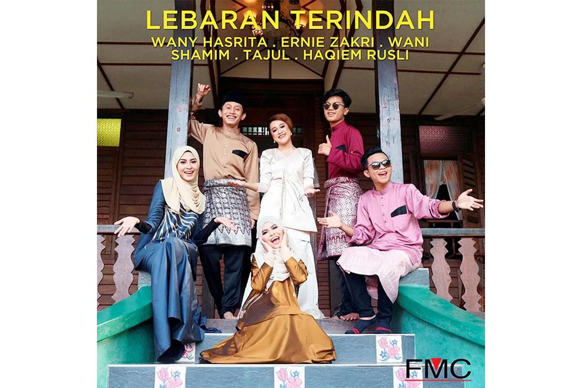 BARU TAPI MEMIKAT: Artis FMC yang terdiri daripada (dari kiri) Wany Hasrita, Shamim, Ernie Zakrie, Haqiem Rusli, Tajul dan Wani (depan) membuktikan lagu Raya baru memikat, seperti Lebaran Terindah, mampu dihasilkan. - Foto FMC -