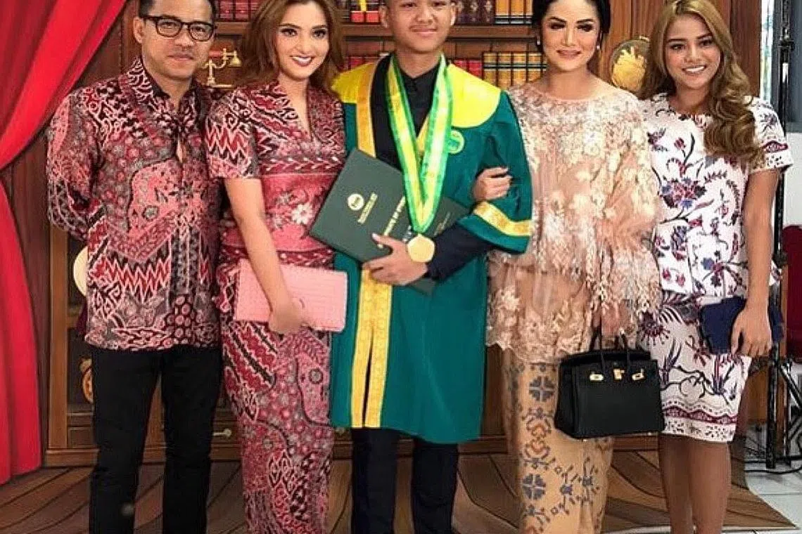 SALAH FAHAM SAHAJA: Ashanty (dua dari kiri) menjelaskan konflik yang diperbesar-besarkan di media sosial tentang anak-anak tirinya, Azriel (tengah) dan Aurel (kanan) dengan ibu mereka, Krisdayanti (dua dari kanan) hanya satu salah faham. Foto dengan Anang (kiri) ini dirakam ketika Azriel tamat pengajian dua tahun lalu. - Foto INSTAGRAM AZRIEL HERMANSYAH -