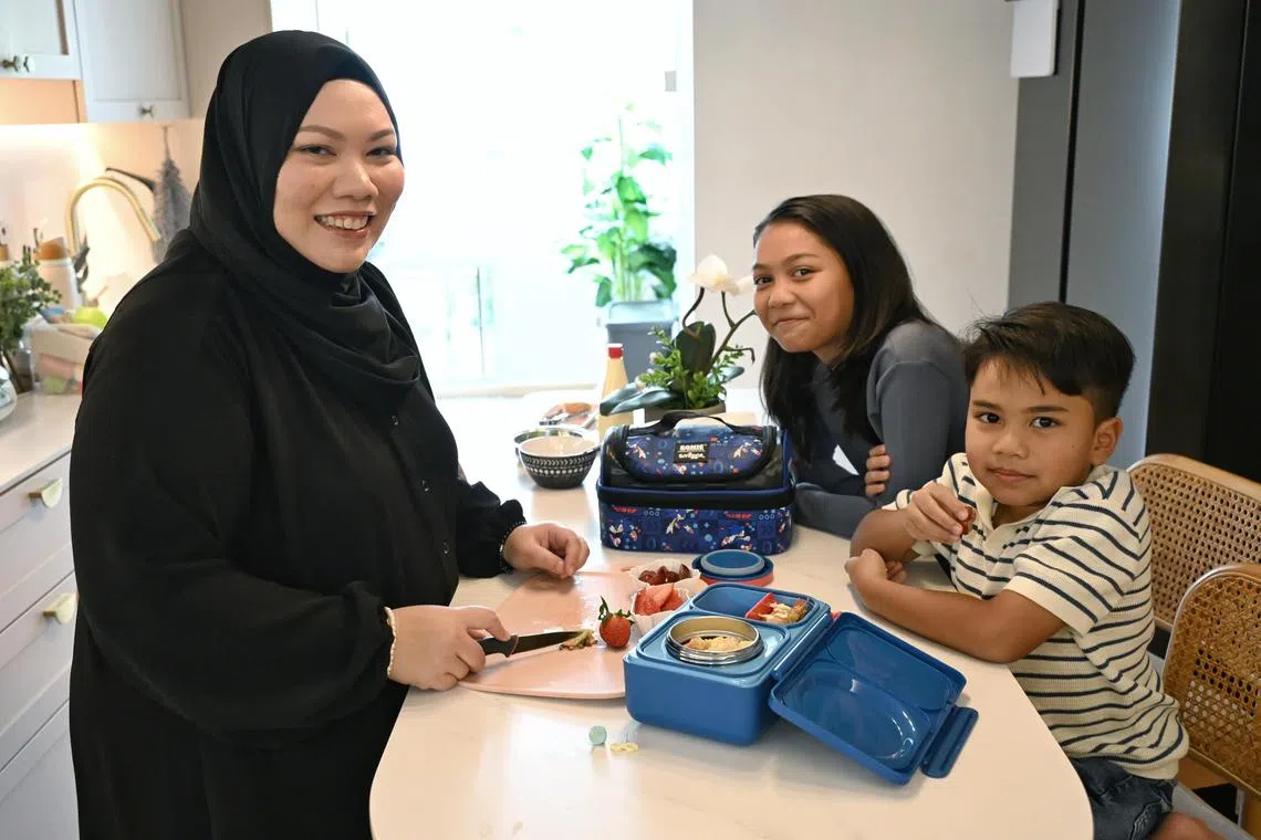 Cik Nordian Razali (kiri) selalu memasak dan menyediakan bekal untuk anak-anaknya, Nadya Raessa, 10 tahun (tengah), dan Raees Nadym, tujuh tahun, nikmati semasa waktu rehat di sekolah. - Foto BH oleh KHALID BABA