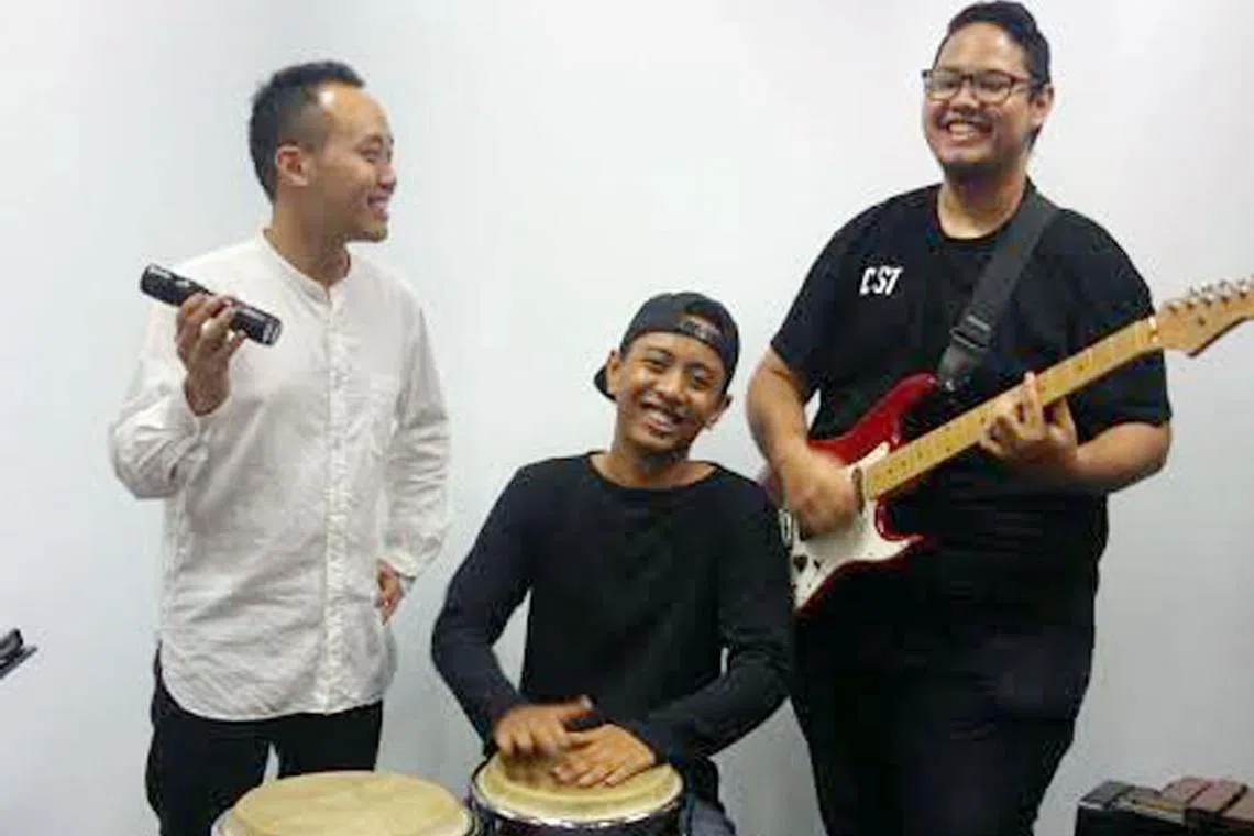 BUKAN HIBURAN SAHAJA: Bermain alat muzik seperti konga dan gitar dalam muzikal 'Letters to ITE' memberi ruang kepada bekas pelajar ITE, Encik Muhammad Fazree Azharie (tengah) dan Encik Sufiyan Sharudin (kanan), memperkasa pengetahuan muzik secara formal dengan bimbingan pengarah muzik, Encik Julian Wong. - Foto ITE -
