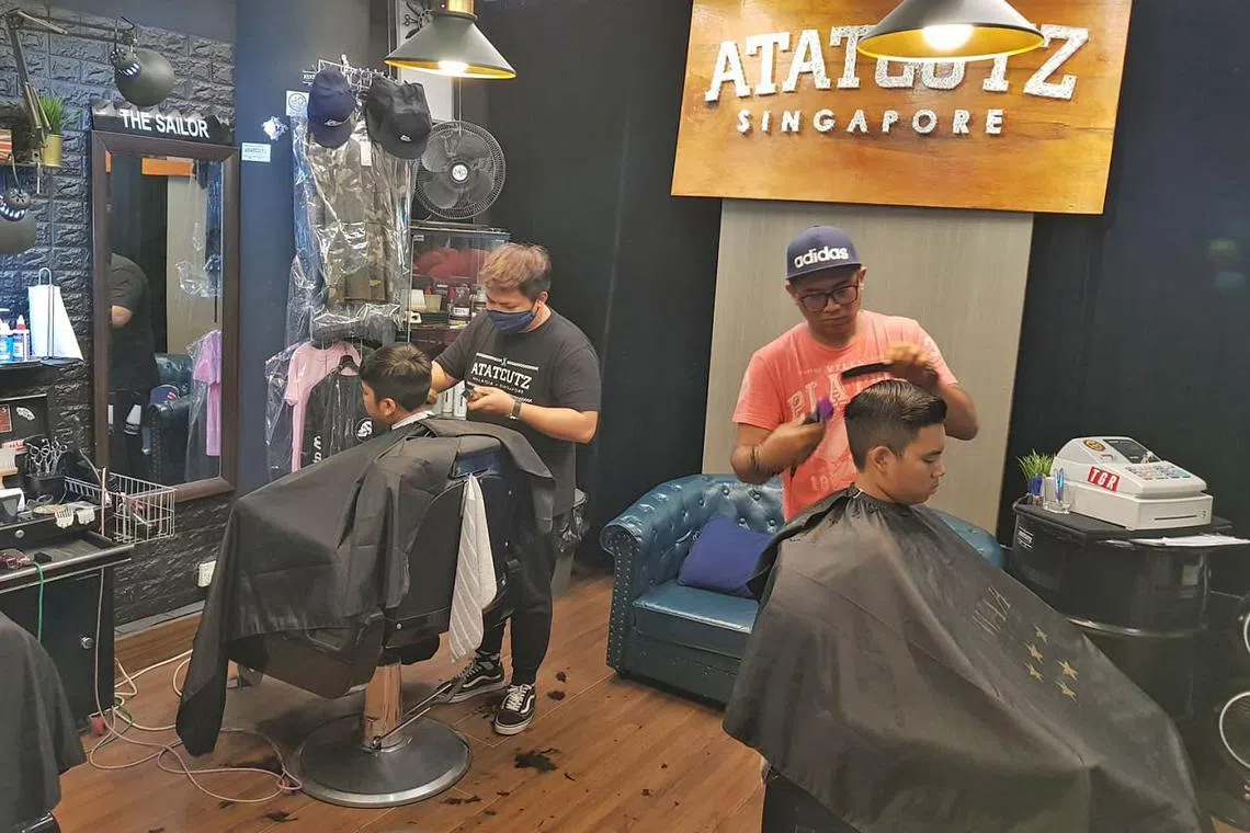GUNTING AMAL: Encik Effendy Ali (kanan, berbaju warna jingga) menggunting rambut pelanggan di kedai gunting lelaki Atatcutz Singapore di Simpang Bedok. Beliau membuka kedai itu November lalu dan sejak itu telah menyertai beberapa acara gunting rambut amal buat golongan berpendapatan rendah. - Foto ATATCUTZ SINGAPORE -