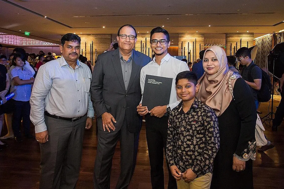 BERJAYA MENDAPAT BIASISWA: Encik Noor Rifat (tiga dari kiri) bersama Encik S. Iswaran (dua dari kiri), serta bapanya, Encik Abdul Malik, seorang pengurus projek; ibunya, Cik Habila Barvin, suri rumah; dan adiknya, Mohamed Miqdaad. - Foto IMDA -